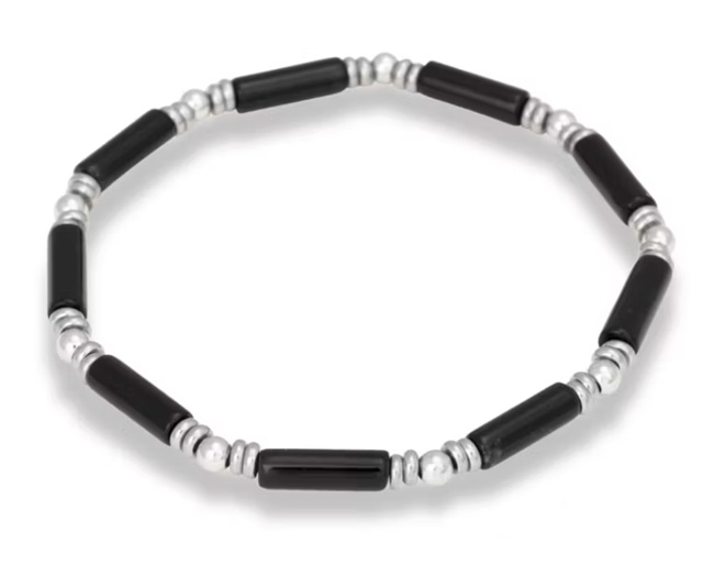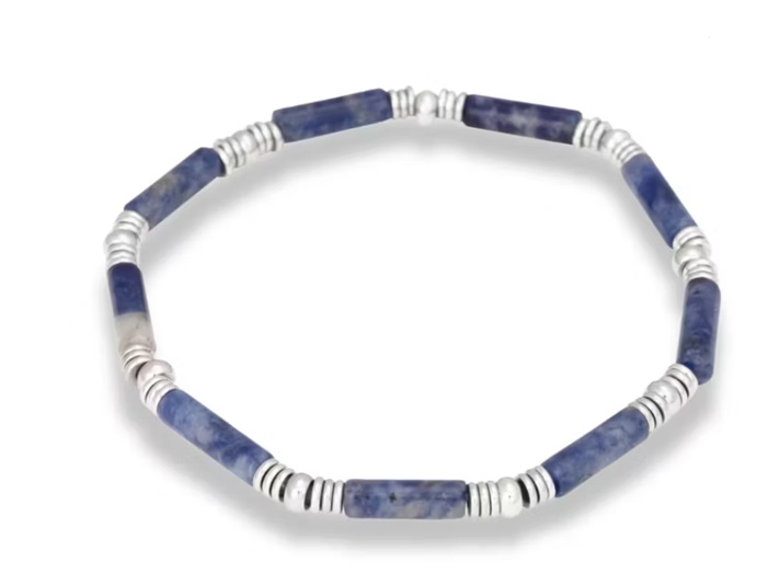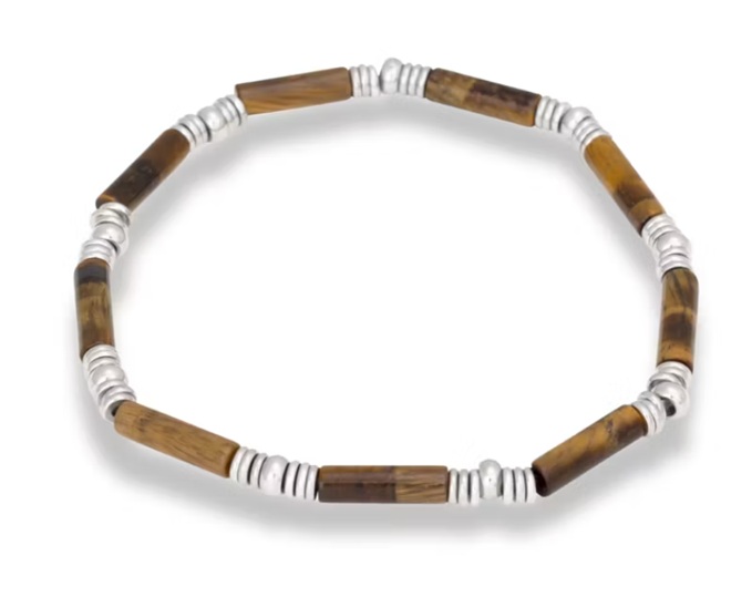 Ett elastiskt armband med blå ädelstenar av tigeröga kombinerat med små kulor av rostfritt stål. Ett elegant armband med subtila detaljer.